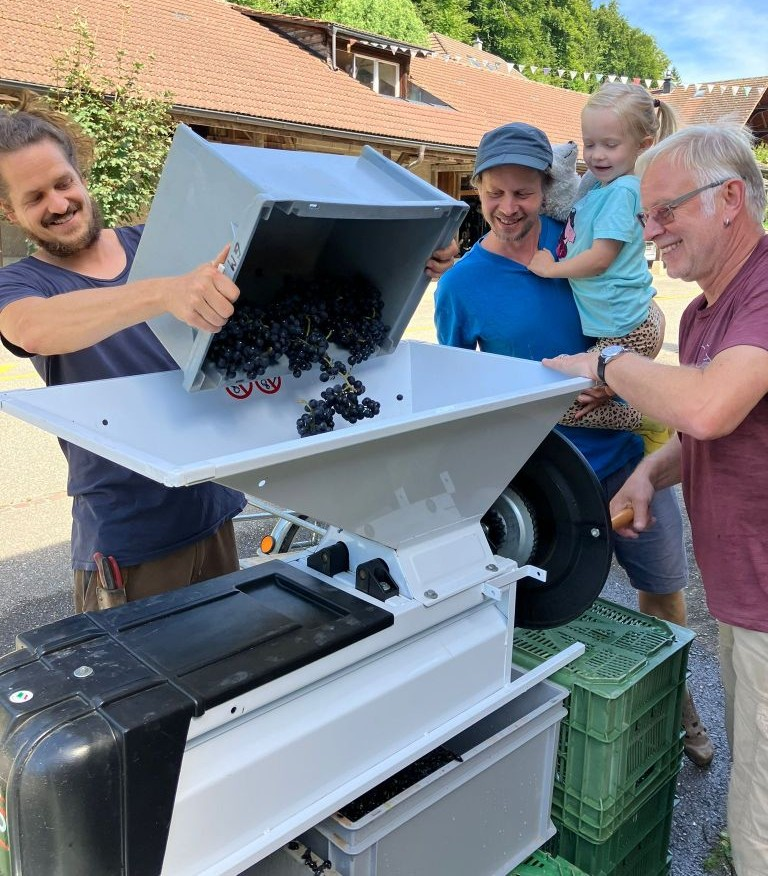 Im September 2025 war es soweit und wir konnten dank toller Gegebenheiten zum ersten Mal Trauben vinifizieren. Romy und Thomas haben in diesem Jahr 120 Stöcke Pinot Noir im Centovalli TI bewirtschaftet. Als Mitglieder von Weinbau Kosmoos haben sie die Trauben geerntet und nach Bütikofen gebracht, wo wir sie im ersten Arbeitsschritt entrappt haben. Unsere handbetriebene Maschine hat einwandfrei die Stiele von den Beeren getrennt.