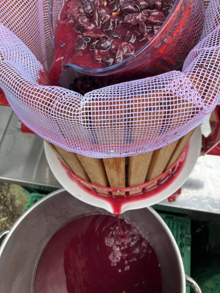 Nach drei Woche ist die Gärung abgeschlossen, alle Zucker abgebaut und die Farbextraktion zufriedenstellend ausgefallen. Nun wird die Maische abgepresst und zurück in den Edelstahltank gefüllt. Die Klärung der restlichen Trubstoffe werden wir weiterverfolgen und den Wein über den Winter reifen lassen. Abfüllen wollen wir diese erste Schaffung im kommenden Sommer.